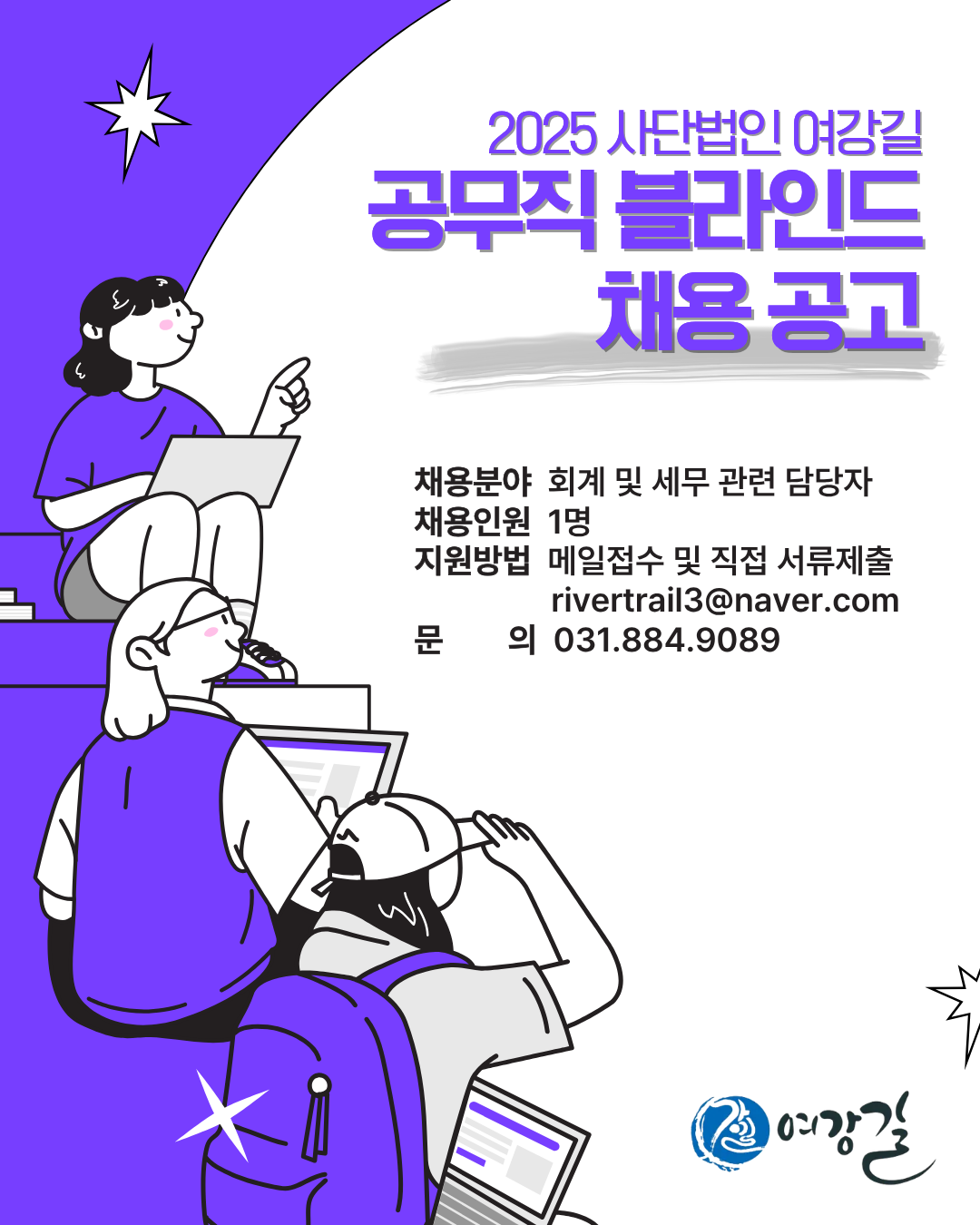 사) 여강길과 함께할 회계 담당자를 모십니다.누군가의 여정에 따뜻한 쉼과 방향을 더해주고 싶은 분이라면, 지금 이 자리에 함께해 주세요.