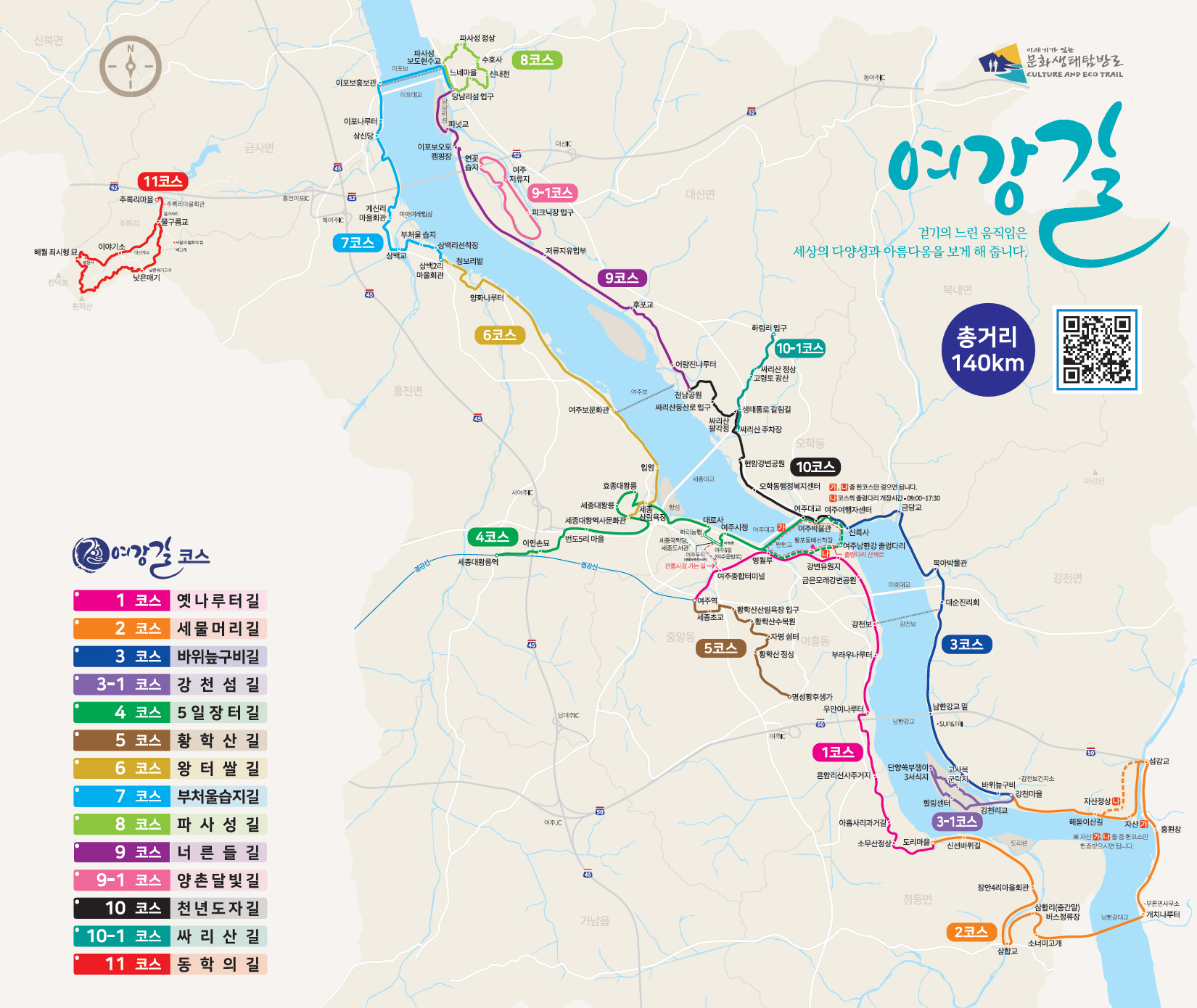 여강길은 여주에 흐르는 여강(남한강)을 따라 총 140km, 14개의 코스를 관리·운영하고 있습니다.